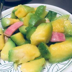 将云瓜和黄瓜切成条,加入蒜末、醋、盐、鸡精、香油等调料拌匀即可。